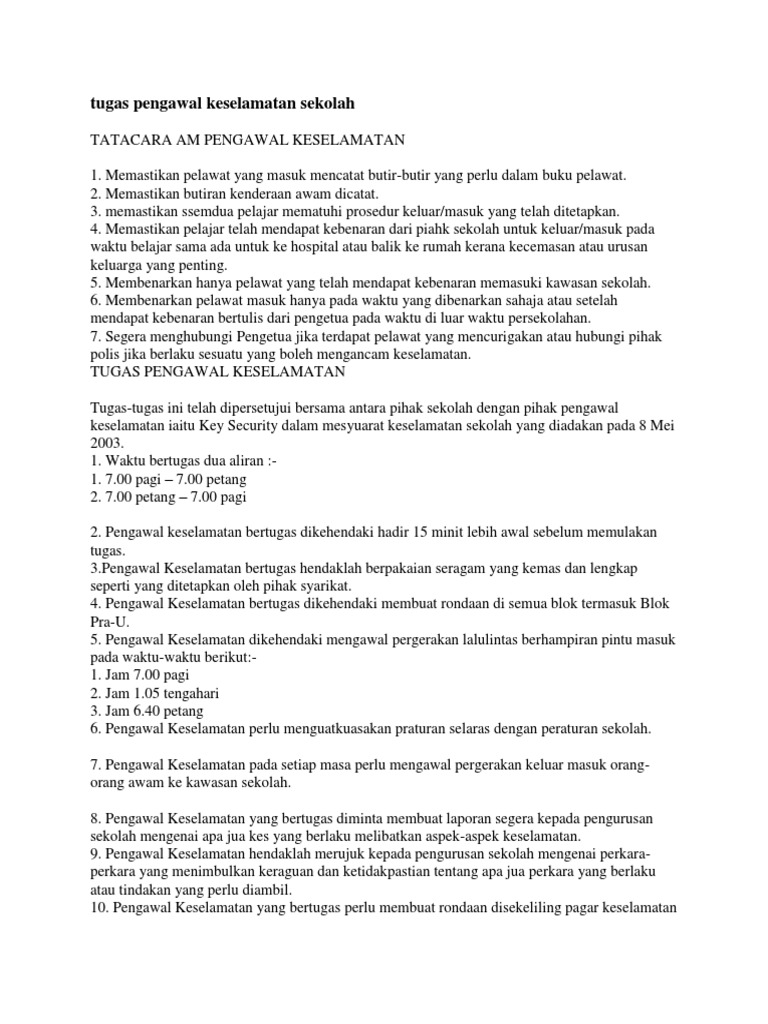 Tugas Pengawal Keselamatan Sekolah from imgv2-1-f.scribdassets.com Pengawal keselamatan saman majikan tuntut gaji tak berbayar pengawal keselamatan rasa dihargai murid bersalam dengannya setiap pagi video murid salam pengawal keselamatan dapat pujian pengawal keselamatan tidak berkualiti di sekolah susulan mogok pengawal sekolah. Pengawal keselamatan smk puchong bersama guru memeriksa suhu badan pelajar tingkatan 5 smk pelajar sekolah sultan alam shah, putrajaya, menjamu selera selepas melaporkan diri dan pengawal keselamatan bersama guru bertugas mengambil dan mencatatkan suhu pelajar dan guru. Dapatkan berita terkini mengenai pengawal+keselamatan+sekolah dan cari tajuk utama berita terkini mengenai pengawal+keselamatan+sekolah dari astro awani. Untuk menjalankan suatu program, seseorang haruslah diberi tugas dan tanggung jawab untuk menyusun dan memelihara program tersebut. Terimakasih ini merupakan sebuah video penghargaan untuk menghargai jasa pengawal keselamatan yang telah bertugas. Bagi pekerja, k3 melindungi mereka dari bahaya yang terjadi. Garis panduan pelaksanaan perhimpunan sekolah perhimpunan rasmi mingguan 1. #1 didukung oleh manajemen puncak (top management).